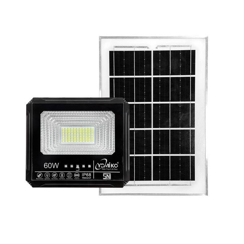 Lampu sorot solar cell adalah lampu sorot yang menggunakan panel surya untuk mengisi daya baterai di siang hari, dan secara otomatis menyala di malam hari untuk menerangi area tertentu. Lampu ini tidak memerlukan aliran listrik PLN dan ideal untuk penerangan di lokasi yang sulit dijangkau, taman, halaman, atau area lain yang membutuhkan pencahayaan tanpa kabel. Fitur utamanya meliputi ketahanan terhadap air (IP67), sensor cahaya untuk menyalakan dan mematikan lampu secara otomatis, serta penggunaan panel surya dan baterai isi ulang (seringkali jenis lithium iron phosphate).